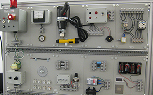 El programa de estudio basado en habilidades presenta actividades prácticas con componentes eléctricos de tipo industrial montados en un panel de control de suministro eléctrico trifásico (PC06) y un panel de transformador trifásico (E003) que se conectan a la estación de aprendizaje JobMaster.